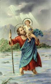 Some statues were of saints–one of my favourites was St. Christopher, who is usually cast holding another statue–presumably the Christ child–on his shoulders, fording a river. I defy you to find where in scripture it says this happened but so what? Chris was the patron saint of travellers.