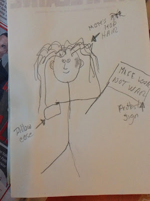 Like every other costume of the time, the hippie one was decided at the next-to-last minute. Tom fashioned a wig from one of  my mom’s mops (a.k.a., he sawed the handle off) and made a protest flag with “MAKE LOVE NOT WAR”–whatever that meant–on it. The only thing missing was the requisite pillowcase for the loot, and I was good to go.