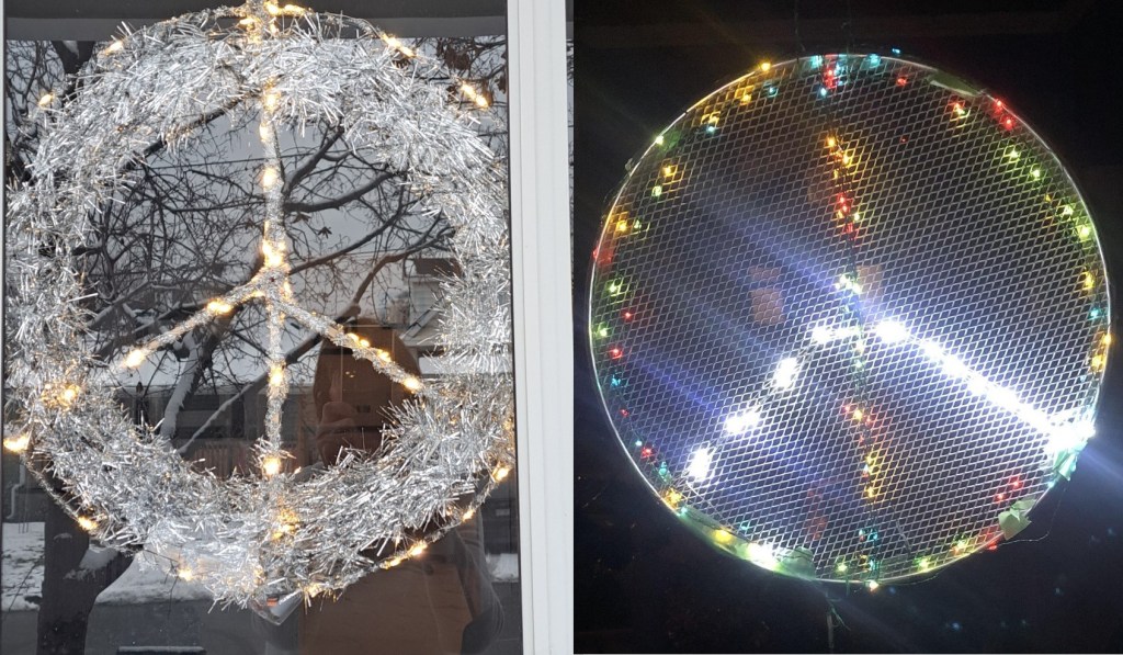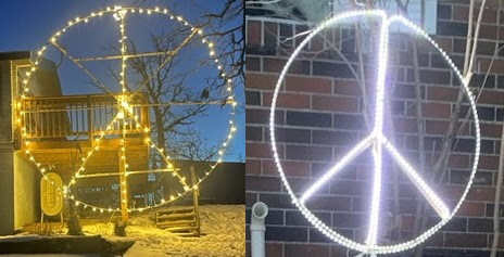My sister Mary has created and hung a peace sign out front of her house. It’s a beaut and it’s in response to a challenge issued by our hippiest sister Charlene to spread the word.